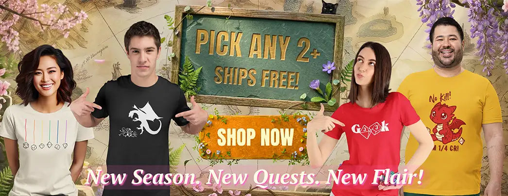 Want an even better roll? Pick ANY 2 shirts and shipping is 100% FREE. Build your bundle, save your gold for dice, and let us handle the logistics.